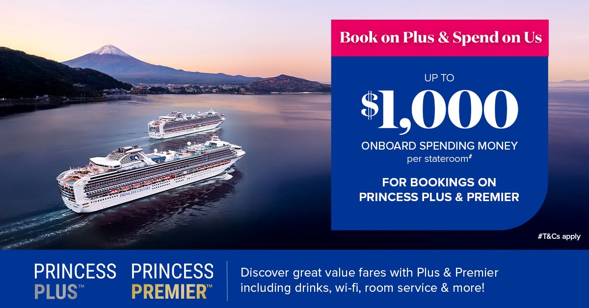 *Fares are cruise only, per person (‘PP’) in AUD, in complete twin stateroom as specified, based on lead categories at publication date 10 March 2026 inclusive of discounts. Offer starts 10 March 2026 00:00 AEDT and ends 30 June 2026 23:59 AEST. Valid for new bookings only. Not combinable with other offers. Supplements apply for higher room grades, categories and fare types. Some staterooms have obstructed views. Onboard currency varies – refer to https://www.princess.com/en-au/faq/onboard-experience# for details. Princess Standard fare is the cruise fare only. Princess Plus fare applies to the first 2 guests in the stateroom and includes the cruise fare packaged with the Plus Beverage Package, 1 device Wi-Fi and more. Inclusions are subject to change – see Fare Terms and Conditions. Princess Premier fare is valid for the first two guests in the stateroom and includes the cruise fare packaged with the Premier Beverage Package, 4 device Wi-Fi and more. Inclusions are subject to change – see Fare Terms and Conditions. First and second guests in a stateroom must be booked on the same fare type. Princess Plus and Princess Premier must be booked for the entire duration of the voyage. #Onboard Spending Money (‘OBS’) Offer (‘OBS Offer’) is per room, in AUD and applied to the first 2 guests in the room only. Amount varies by itinerary duration as specified. When booking on a Princess Standard fare: for cruises 6 nights and under - receive up to $40 OBS per room; for cruises 7-17 nights - receive up to $120 OBS per room; for cruises 18-31 nights - receive up to $250 OBS per room; for cruises 32 nights and over - receive up to $400 per room. When booking on a Princess Plus or Princess Premier fare: for cruises 6 nights and under - receive up to $100 OBS per room; for cruises 7-17 nights - receive up to $300 OBS per room; for cruises 18-31 nights - receive up to $600 OBS per room; for cruises 32 nights and over - receive up to $1000 per room. Amount varies by itinerary duration as specified. OBS expires at the conclusion of your cruise, is not transferable, not refundable, not redeemable for cash and cannot be used in the casino or medical centre). All travel is subject to Princess Cruises Passage Contract at https://www.princess.com/enau/legal/passage-contract which guests are bound by. Cruise itineraries and onboard offerings are not guaranteed. Charges may apply for some activities, venues and menu items. Credit card surcharges (Visa/Mastercard 1.1%; AMEX/Diner’s Club 2.75%). Carnival plc trading as Princess Cruises ABN 23 107 998 443.